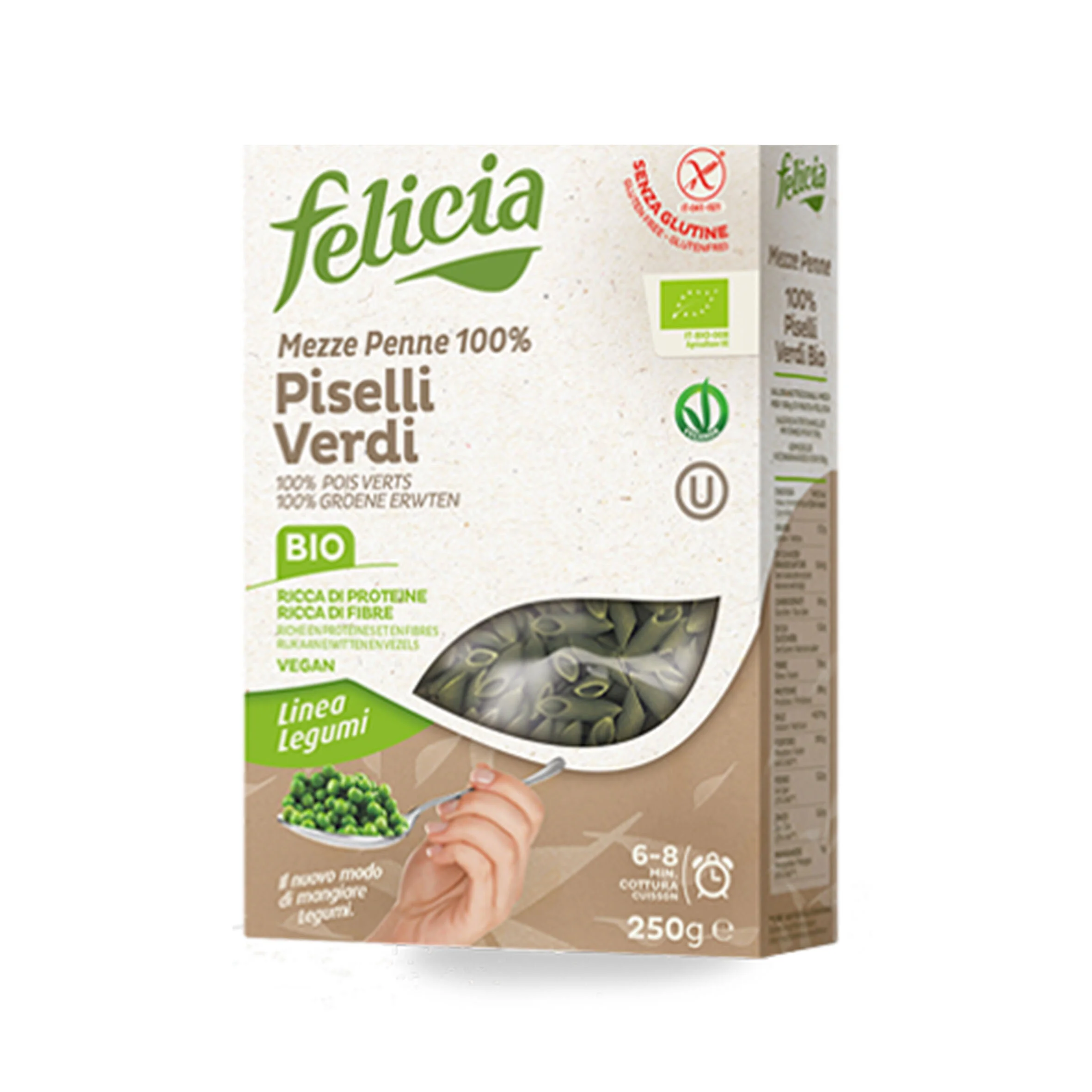 Felicia Organic Gluten-Free High Protein Pasta Non-GMO 3 Shape Variety 1 each. Felicia Bios Green Pea Fusilli is a product with all the benefits of legumes in a paste with a unique flavor.